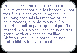 Les caractéristiques de goût a permis de décrocher une Indication Géographique Protégée et récemment une Appellation d'Origine Contrôlée qui permet d'avoir maintenant des agneaux nés et élevés à Pauillac